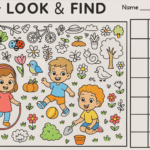 Une scène colorée avec des enfants qui jouent dans un jardin 🌳 Une checklist illustrée à droite avec des objets à retrouver et colorier 🔍 Un style enfantin, joyeux et printanier 🌸🦋