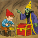 Dans sa caverne, un petit nain très riche est en train de travailler. Il taille une couronne en or, une vraie couronne de roi. Quand soudain apparaît Poison, l’affreux sorcier. « Donne-moi ton trésor ! » ordonne-t-il avec une horrible grimace. — « Tu es fou, sorcier de malheur…............