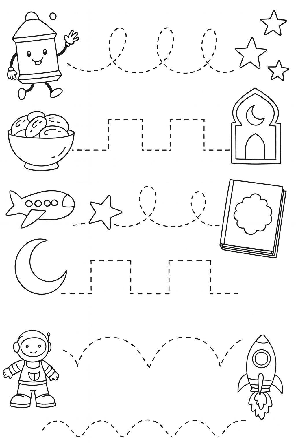 Ces fiches de traçage sur le thème du Ramadan sont parfaites pour développer la motricité fine des enfants tout en découvrant les symboles de ce mois sacré. Lanternes, mosquées, Coran, tapis de prière, dattes… chaque ligne à suivre relie des éléments emblématiques du Ramadan dans un style ludique et éducatif. À imprimer pour les enfants dès 3 ans, à la maison ou en classe.