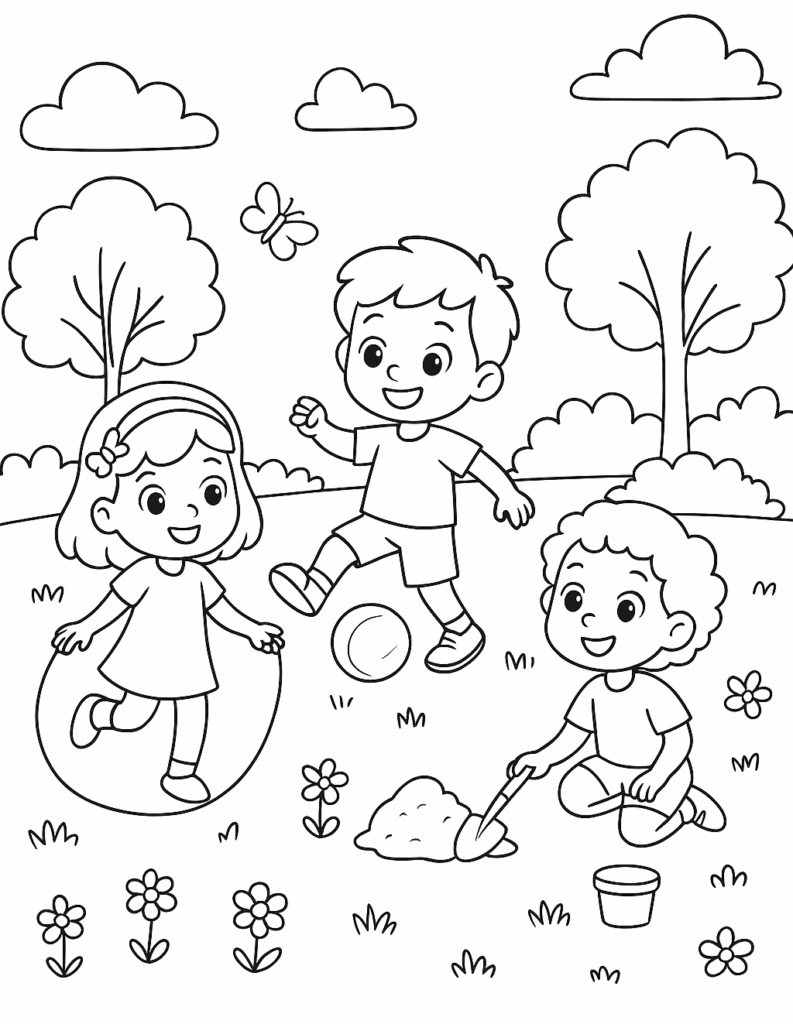 Voici une feuille de coloriage représentant des enfants qui jouent joyeusement dans un jardin